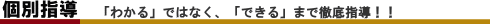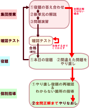 | 適度な緊張感の中で競争し、互いを高め合う「集団授業」。 キメ細かく、一人一人の弱点をフォローする「個別指導」。 両方の長所を取り入れた究極の徹底確認、名付けて「完全学習」を実施しています。 |